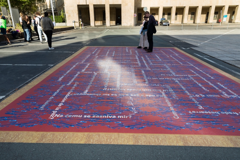 Das globale Wettrüsten wird oft mit Friedenserhalt begründet, jedoch ist das Gegenteil der Fall: Die bloße Existenz von Waffen ist als Bedrohung bereits eine Form der strukturellen Gewalt. Die Bodenposterarbeit der Künstlerin Stephanie Hanna ist einem Perserteppich bzw. einem afghanischen Kriegsteppich nachempfunden. Die zentrale Frage: »Worauf basiert Frieden?« In zahlreiche Sprachen übersetzt, spannt sie sich über ein filigranes Muster, dessen Grundmotive erst auf den zweiten Blick als Waffenabbildungen erkennbar werden.